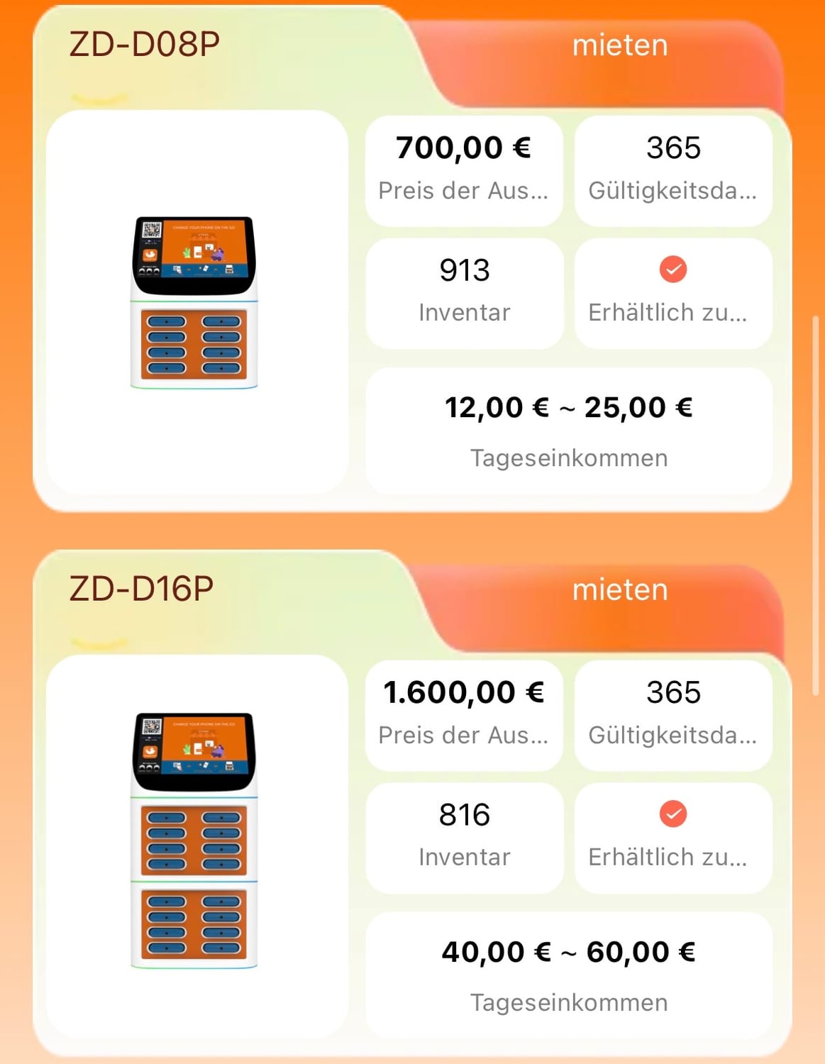 Die Umsätze von Orange Cat Energy entstehen durch die Nutzung realer Geräte an realen Standorten. Du kannst an dem Ganzen teilhaben, in dem du dir eine physische Powerbank-Ladestation für ein Jahr lang mietest. Durch deren Nutzung erhältst du von Montag bis Freitag täglich Mieteinnahmen, die du dir wöchentlich auszahlen lassen kannst. Die Einnahmen an Wochenenden werden dazu genutzt, um die Unkosten der Geschäfte zu begleichen.